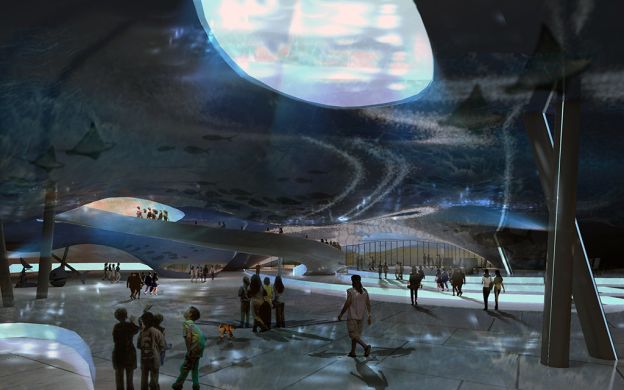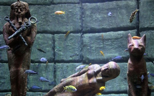 The main tank was designed and decorated by an Italian sculptor, Benedetti, inspired by coral reefs and featuring a life-size airplane, shipwreck and submarine.