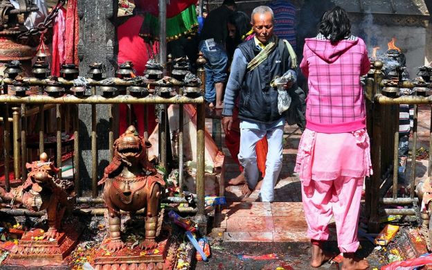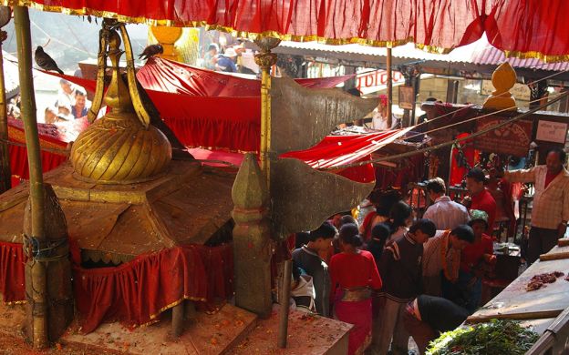 Dakshinkali Temple or Dakshin Kali Temple is located 22 kilometres outside Kathmandu, and only a kilometre away from the village of Pharping. The place of worship is one of the most important temples in Nepal and is dedicated to the fierce and feared Goddess Kali. The fame of this temple lies in its rituals and traditions. Twice a week, animals are sacrificed at this religious place - uncastrated male goats and cockerels in particular – as an offering to the ferocious spouse of Lord Shiva. The temple was built in 1855 by Rani Rashmoni, a devotee of Kali. The Dakshinkali Temple derives its name from a compound of the words 'Dakshin', which means 'south', and the name 'Kali', which signifies the deity that is worshipped here.