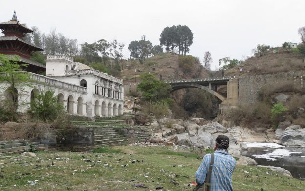Chovar gorge, the only outlet for all the water of the valley. Legend has it that Manjushree, an ancient saint from China, cut the mountain with his magical sword to drain out the water from the Kathmandu Valley Lake to make it habitable. There is a small but picturesque temple of Adinath on the top of the hill with a magnificent view of the snowcapped peaks. Just beyond the gorge is a temple of Lord Ganesh. The main image of the shrine is a massive rock, naturally carved.