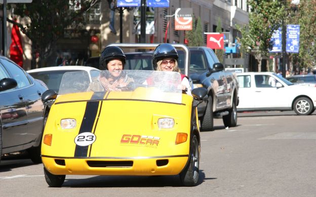 Your GoCar is controlled with a motorcycle-style handle, throttle, and hand brakes. This 3-wheeled car seats two and has a lockable trunk for your things. Their small size makes parking a breeze.