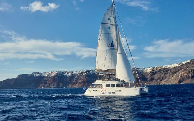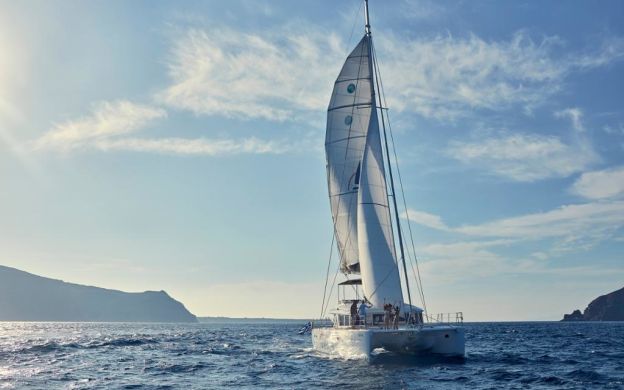 The next stop is White Beach where the guests can enjoy swimming and snorkelling for 1 hour and 30 minutes while the BBQ menu is being prepared by the crew. Then the tour continues sailing below the Indian Rock, the ancient Lighthouse, Akrotiri, and the Aspronisi island to reach the third stop, the Hot Springs and the guests can also swim in this stop for 30 minutes. Reaching the end of the tour, sailing below the caldera towards Oia to watch the sunset just outside Ammoudi port below the Oia village.